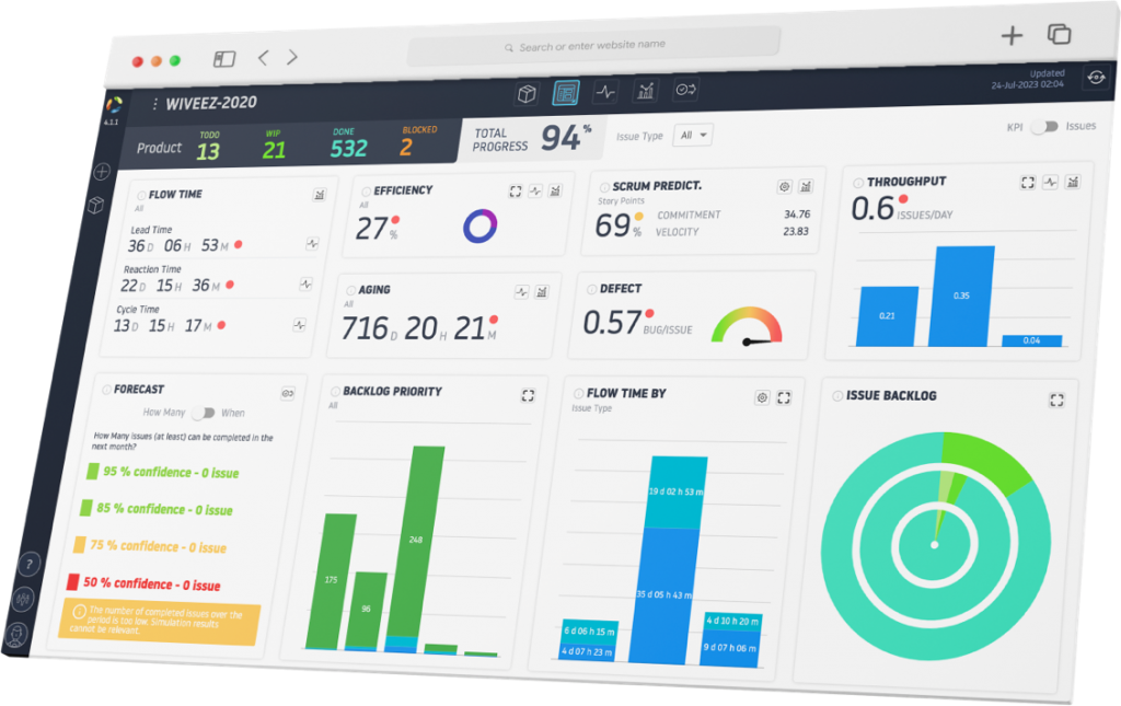 Créez votre compte Wiveez et connectez-le en quelques secondes avec votre instance JIRA. Chargez vos projets JIRA et générez automatiquement vos tableaux de bord et vos indicateurs Lean – Agile